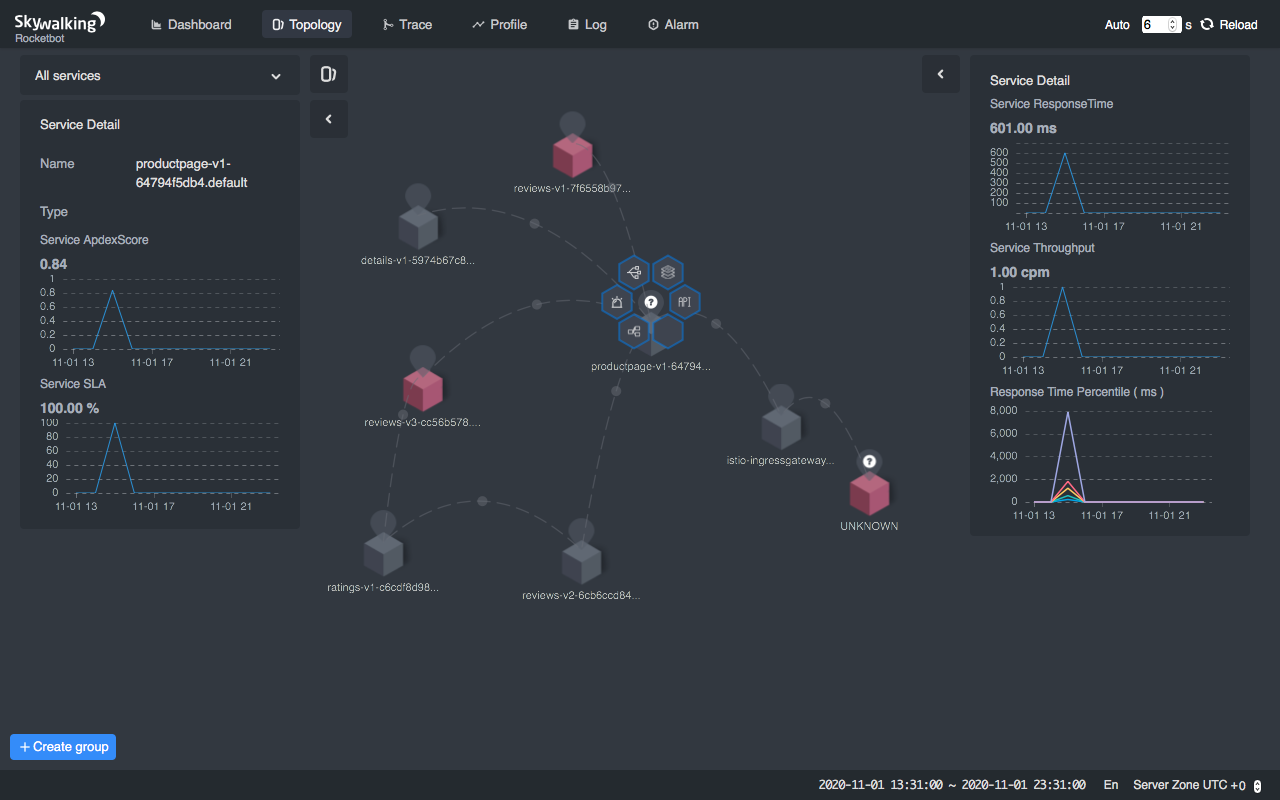 这样做,你就成功完成设置了!再查看 SkyWalking 的 WebUI,你应该会看到 bookinfo 应用的拓扑,以及它每一个单独服务的指标数据。